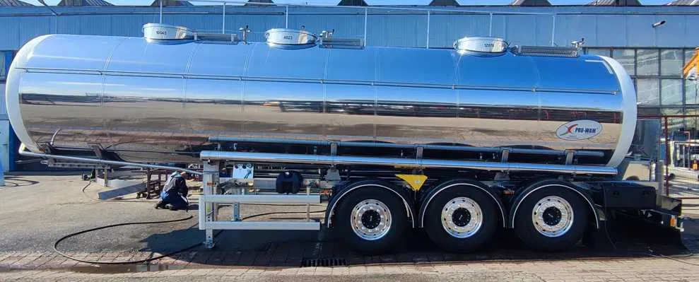 mycie zbiornika cysterny- cysterna wyposażona jest w centralny układ mycia w systemie zamkniętym CIP (np. w 1 komorze zainstalowane są 2 głowice, w drugiej – 1 głowica, w trzeciej – 2 głowice), konstrukcja cysterny oraz rozmieszczenie włazów umożliwia mycie cysterny w stacjach mycia cystern. Przyłącze układu mycia zakończone zaworem DN50DIN wyprowadzone na prawą stronę cysterny